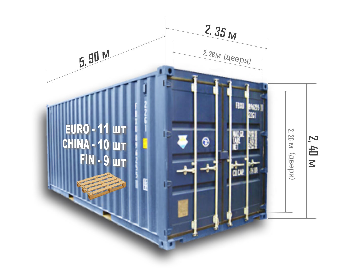 - PW (Pallet Wide) — увеличенный по ширине контейнер (242—245 см; позволяет разместить рядом два стандартных поддона по 120 см)