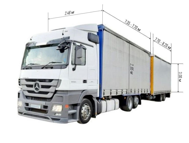 Большая общая длина позволяет разместить до 39 евро паллет. Такой тип конструкции удобен для загрузки различных видов товаров, обеспечивая универсальность перевозки широкого спектра грузов различного назначения. Шторная конструкция боковых стенок дает возможность размещать грузы шириной до 250 см.